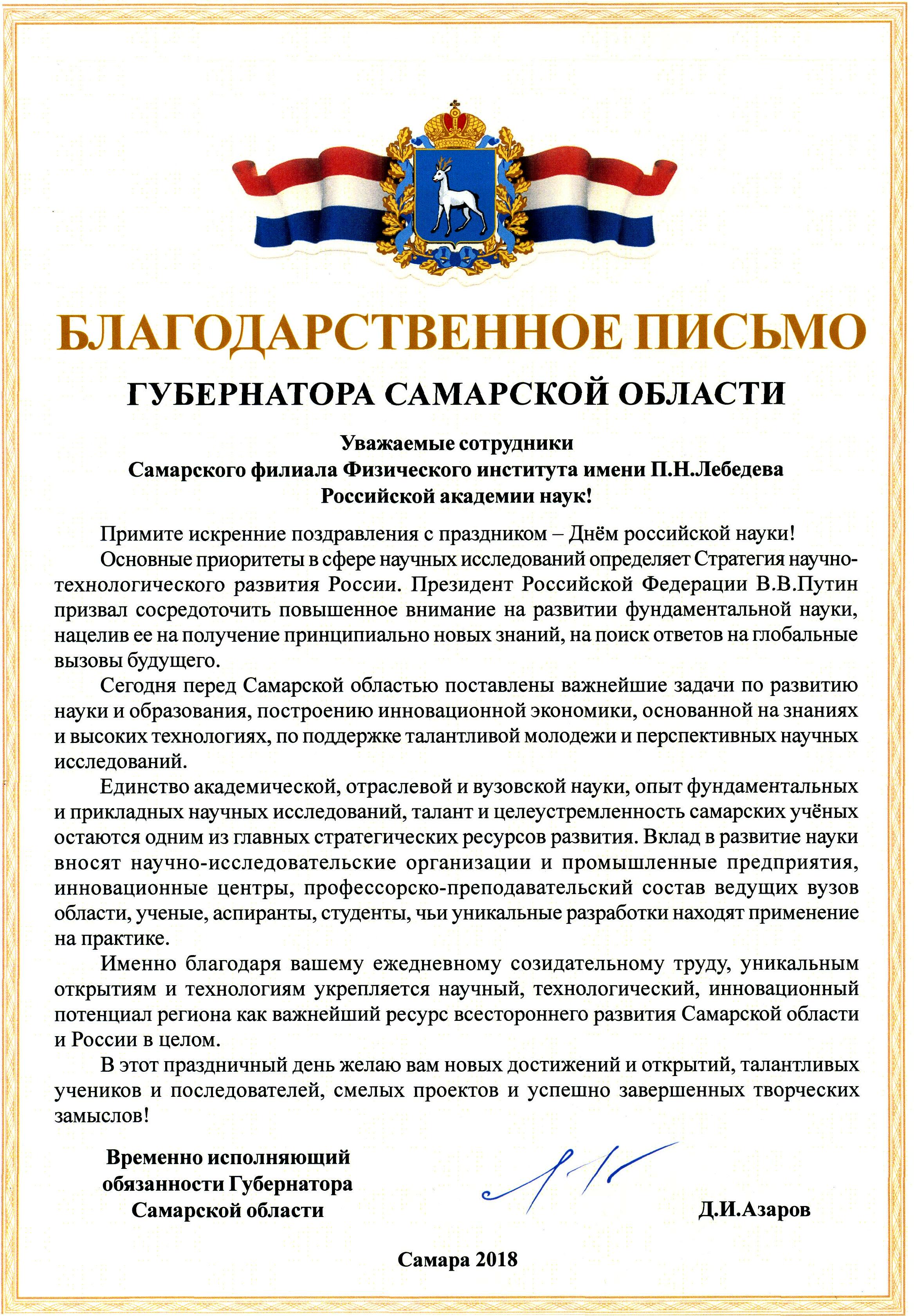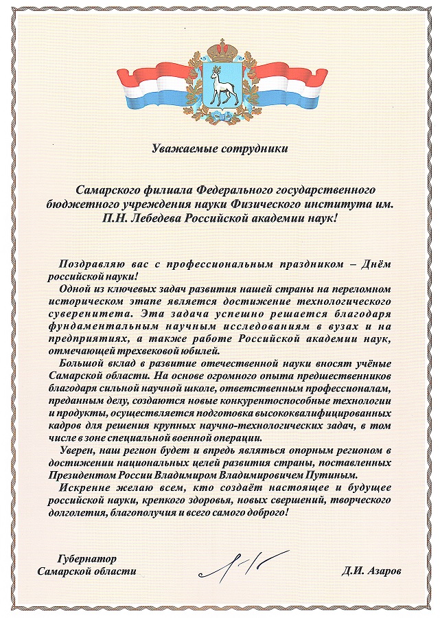 Ко Дню российской науки от Губернатора Самарской области Вячеслава Андреевича Федорищева в Самарский филиал ФИАН поступили Поздравительный адрес и Благодарственные письма отдельным сотрудникам.