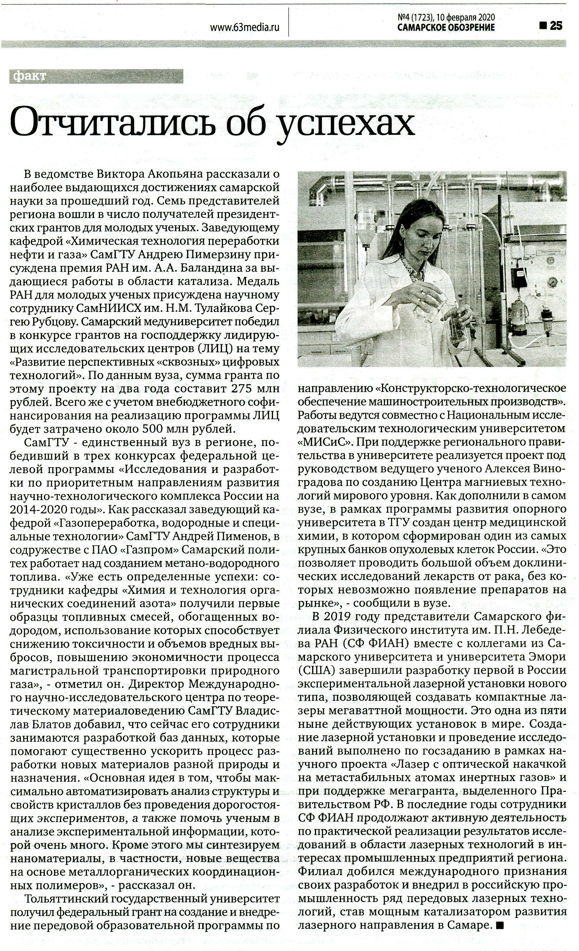 Новости. Подведены итоги областного конкурса "Молодой ученый" 2025 . Конкурс проводится Министерством образования и науки Самарской области. В списке победителей научные сотрудники СФ ФИАН: Дарья Прокопова, вк с.н.с. ЛКО, к.ф.-м.н. (номинация "Естественные науки. Кандидат"); Дарья Агапова, вк м.н.с. теоретического сектора СФ ФИАН, аспирант Самарского университета, (номинация "Естественные науки. Аспирант"); Алина Кузнецова, вк м.н.с. ЦЛА СФ ФИАН, аспирант Самарского университета; Евгения Батракова, вк м.н.с. ЦЛА СФ ФИАН, аспирант Самарского университета(номинация "Естественные науки. Студент").