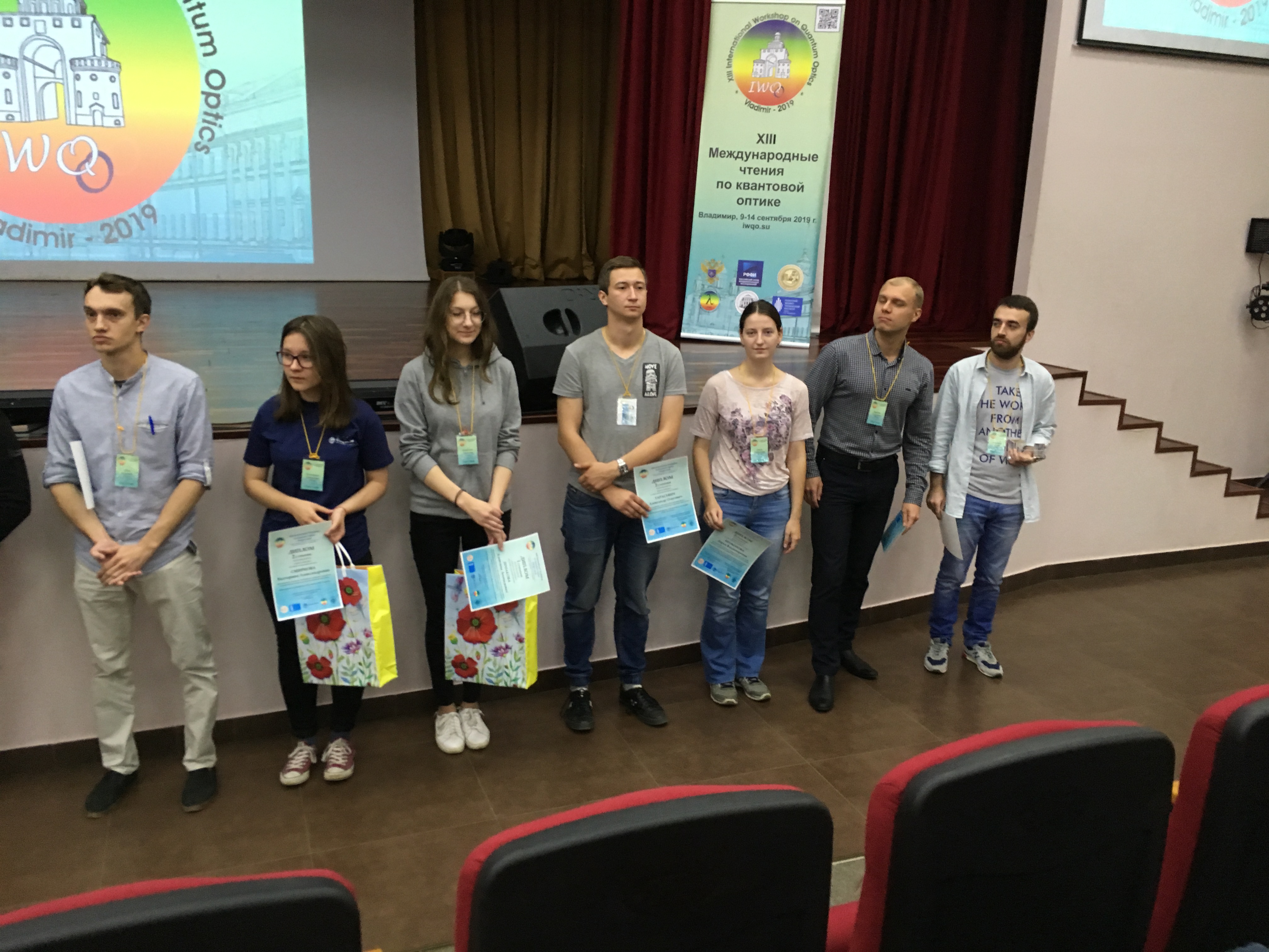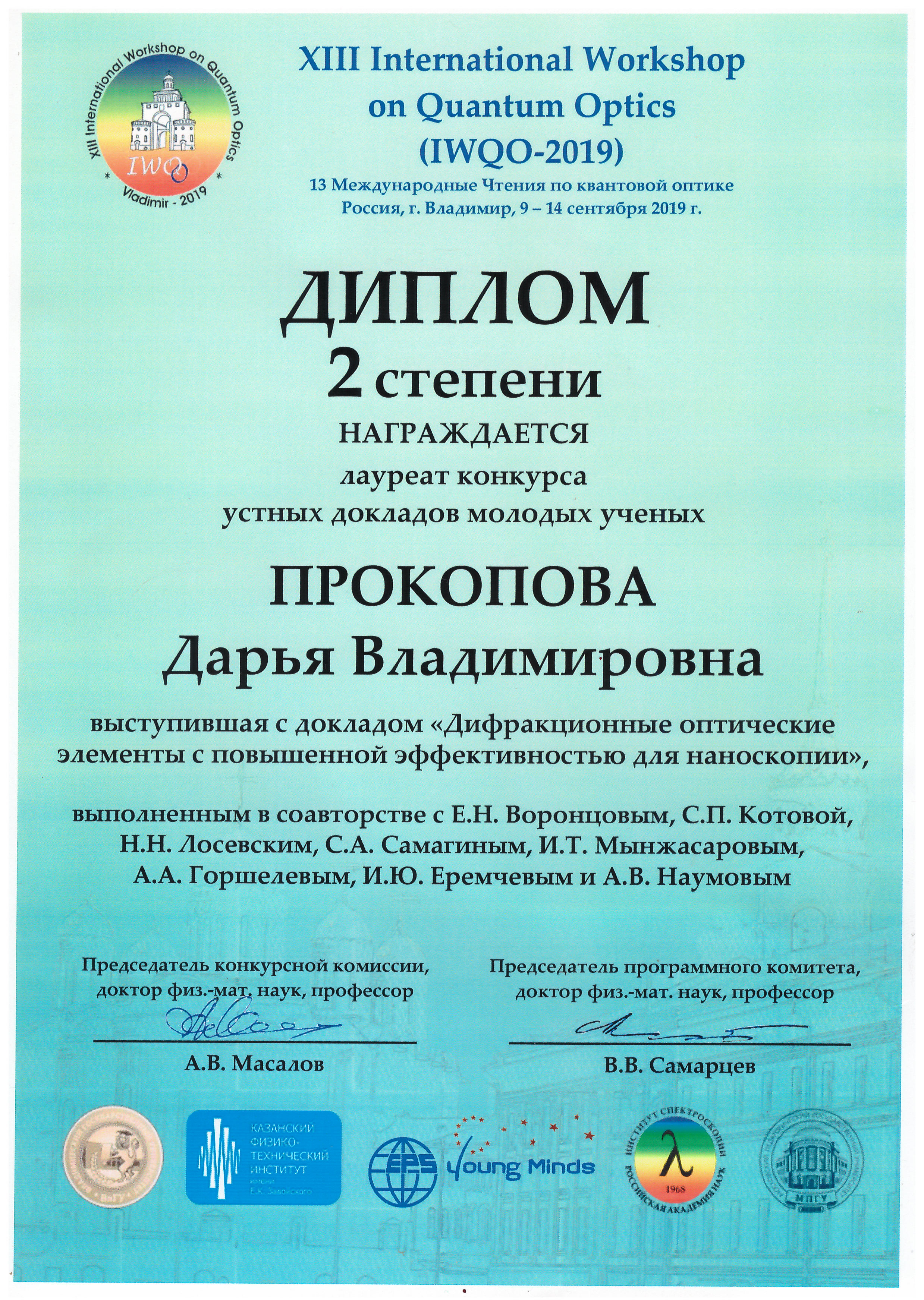 Поздравляем Афанасьева Кирилла Николаевича инженера лазерно-измерительной лаборатории с награждением Дипломом VIII Международной Молодежной Научной Школы "Когерентная оптика и оптическая спектроскопия" за лучший доклад на тему Анализ влияния дискретизации фазы на качество спиральных пучков (Казань, 2004).