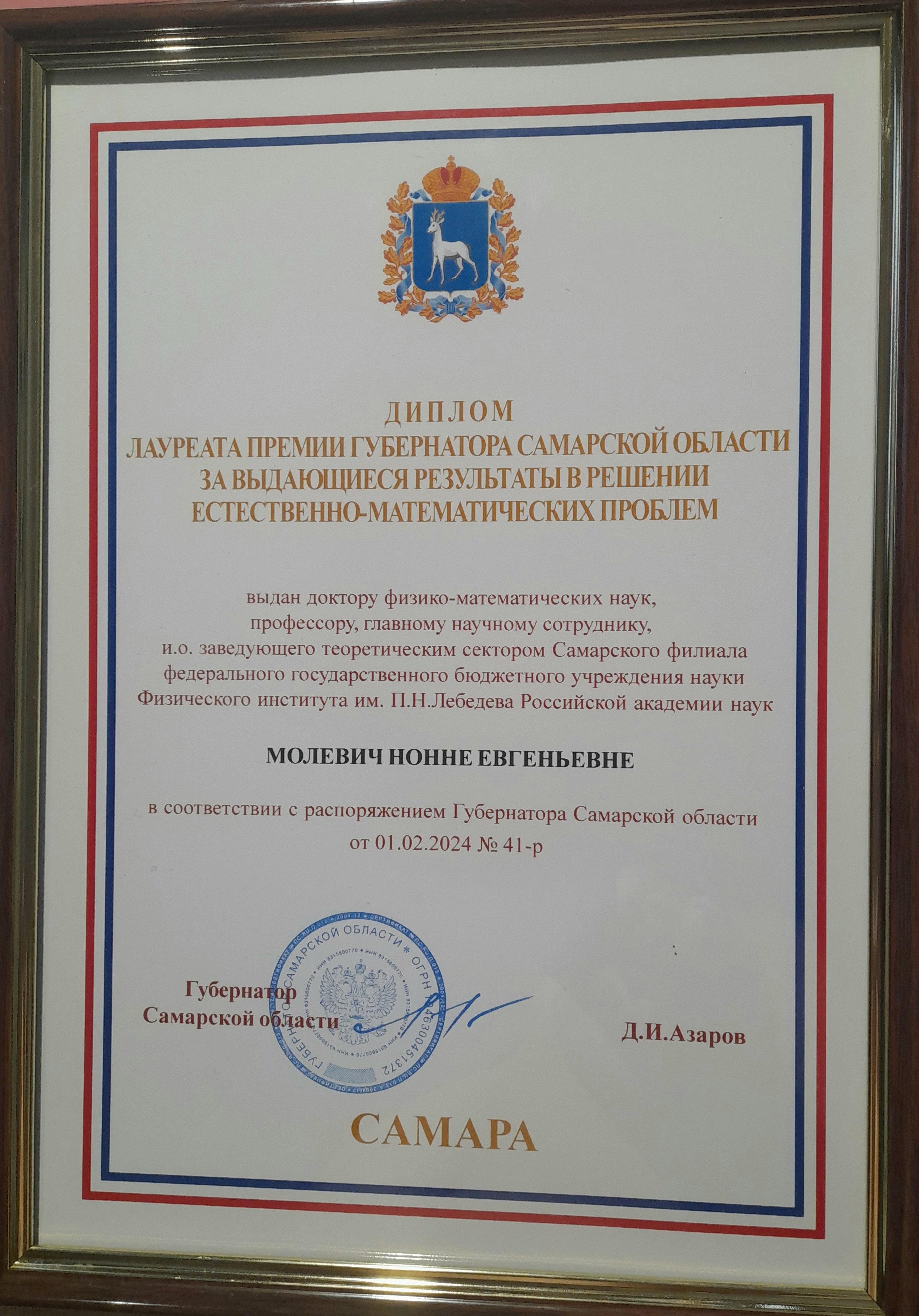 Новости. Сотрудники СФ ФИАН стали Лауреатами Губернской премии в области науки и техники за 2025 год . В соответствии с распоряжением Губернатора Самарской области от 30.01.2026 № 34-р награда присуждена