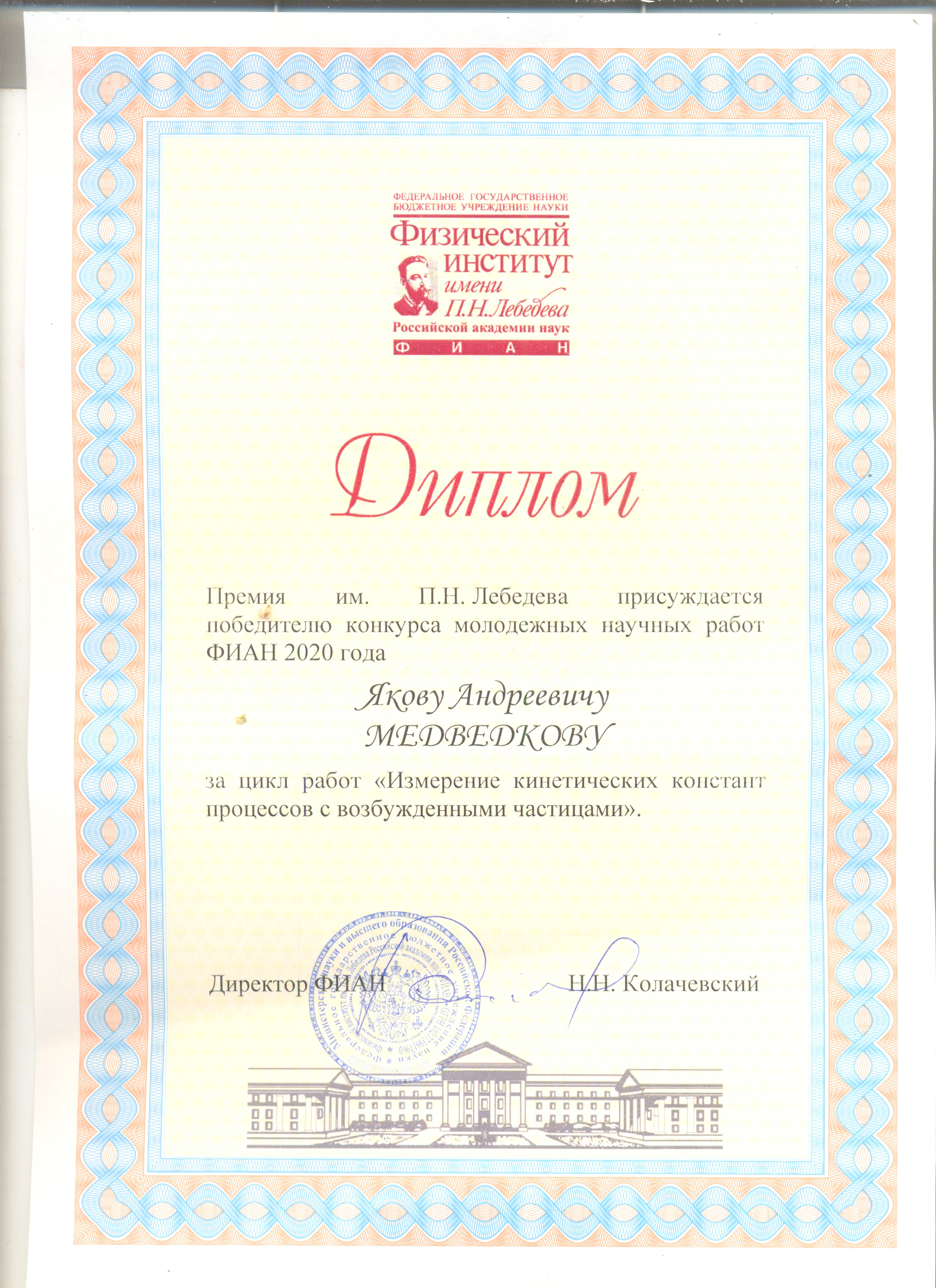 Новости. 7-9 октября 2025 года в Самарском национальном исследовательском университете имени академика С.П. Королёва прошла Всероссийская молодёжная научная конференция с международным участием «XVIII Королёвские чтения», посвящённая 80-й годовщине Победы в Великой Отечественной войне. Дипломом за лучший доклад награжден вк младший научный сотрудник СФ ФИАН, аспирант Самарского университета Руслан Курамшин, представивший в секции «Фундаментальная и прикладная физика» доклад «Моделирование двухчастотных схем накачки для лазера на метастабильных атомах аргона». Работа выполнена в лаборатории физико-химической кинетики под руководством вк гл.н.с., зав. лаб. д.ф.-м.н. П.А. Михеева и вк с.н.с. к.ф.-м.н. А.П. Торбина. Поздравляем коллег и желаем дальнейших успехов!