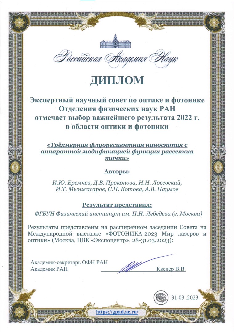 на премию Физического института им. П.Н.Лебедева РАН. Вторая премии присуждена сотрудникам лаборатории химических и электроразрядных лазеров СФ ФИАН: Загидуллину М.В., Николаеву В.Д., Свистуну М.И. и Хватову Н.А. за цикл работ “Разработка и исследование химического кислородно-йодного лазера”.