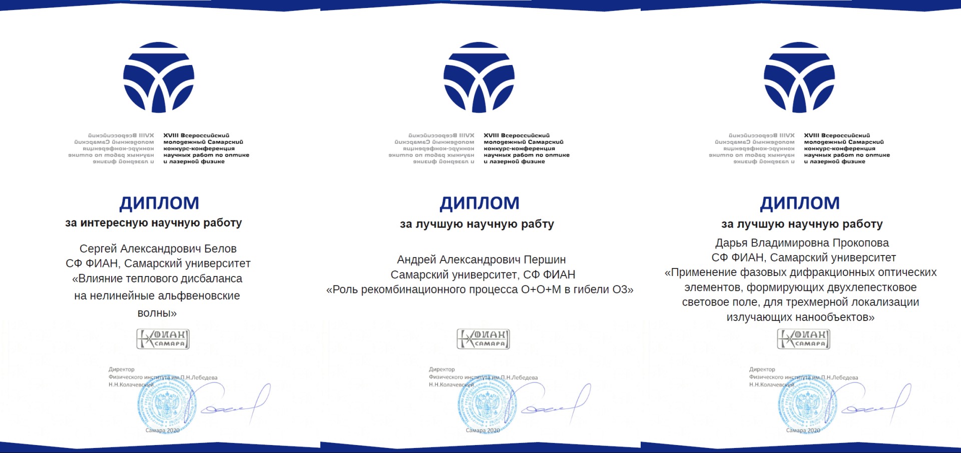 Поздравляем!!! 1-7 апреля в Москве состоялась Десятая Всероссийская научная конференция студентов-Физиков и молодых ученых. Устные доклады молодых сотрудников Самарского филиала ФИАН Ивана Антонова и Сергея Самагина по результатам конкурса работ были награждены дипломами второй и третьей степени на секциях «Оптика и спектроскопия, квантовая электроника», «Оптика. Лазеры. Материалы оптоэлектроники».