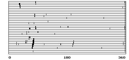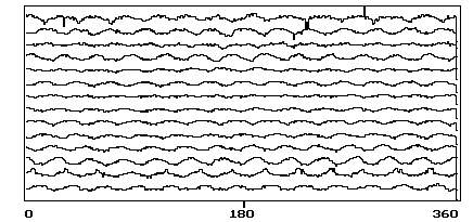 диаметр от 15 до 25 мм; ширина до 4,2 мм; радиус кривизны - от 2,5 до 3 мм.2. Размер микродефектов, которые должны быть обнаружены 40 мкм и более. 3. Отклонения от круглости, которые выявляются системой, имеют амплитуду 0,4 мкм и более. 4. Время контроля одной детали в автоматическом режиме 1,8 сек. На рис.2 и 3 показана топограмма дорожки качения кольца шарикоподшипника типа 201 при контроле локальных микродефектов и отклонений от круглости. |