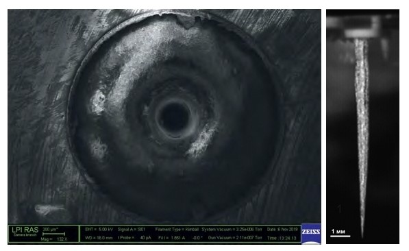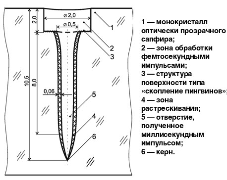 В СФ ФИАН совместно с ТГУ (Тольятти) разработан эффективный способ пробивки глубоких отверстий (более 10 мм) в оптически прозрачных материалах с отношением глубины отверстия к диаметру отверстия 50 и более.