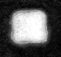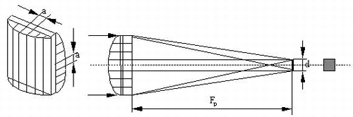 | Растр представляет собой два набора скрещенных призм с размером грани "а". Профиль каждого набора является частью многоугольника, вписанного в окружность. Оба набора, сложенные вместе, образуют совокупность призм фокусирующий призменный растр (рис.3). Степень равномерности распределения плотности энергии излучения в поперечном сечении луча зависит от числа ячеек, охватываемых пучком. Чем больше таких элементарных ячеек, тем однороднее будет распределение интенсивности по сечению фокального пятна (рис.4). | |||||