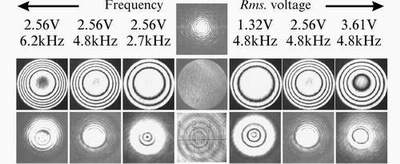 Интерферограммы волнового фронта (средний ряд) для различных управляющих напряжений и частот (цифры в верхнем ряду). Нижний ряд - соответствующие распределения интенсивности в фокусе. Для сравнения приведено распределение интенсивности в фокусе обычной стеклянной линзы с апертурой 5 мм и фокусным расстоянием 1м (середина верхнего ряда). | ||||||