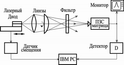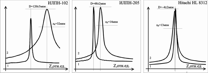 Преобладающим типом аберраций волновых фронтов (ВФ) лазерных диодов является астигматизм, который обусловлен сильной асимметрией активной области и различием механизмов бокового и поперечного ограничения поля внутри лазерного волновода. Интерферометрические методики измерения ВФ не различают причин появления астигматизма. Однако производителям полупроводниковых лазеров и корректирующих оптических систем важно знать вклад от каждого из факторов по отдельности. Известно, что при фокусировке волнового фронта с единственной доминирующей аберрацией величину искажения можно количественно оценить по форме продольного профиля интенсивности в области точки фокуса. Это обстоятельство используется в установке, созданной в СФ ФИАН для оценки "волноводного" вклада в астигматизм путем измерения астигматического расстояния D. | ||