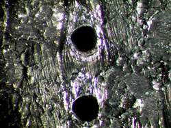 термического влияния менее 1,5 мм. Использование для резки импульсно-периодического лазерного излучения с частотой следования импульсов более 100 Гц позволяет получать качественный рез при скорости, сопоставимой со скоростью резки непрерывным излучением, обеспечивая зону термического влияния не более 0,5 мм. Лазерное излучение является наилучшим в настоящее время инструментом для раскроя углеродных тканей. Для резки углеродных тканей можно использовать как непрерывное, так и импульсно-периодическое с высокой частотой повторения импульсов лазерное излучение. Мощность излучения определяется толщиной ткани и необходимой скоростью резания. Лазерное сверление отверстий в импульсном режиме является эффективным способом получения отверстий в углеродных композиционных материалах. Минимальный диаметр отверстия определяется диаметром пятна фокусировки и не превышает для технологических лазерных установок 0,5 мм. Точное позиционирование позволяет осуществлять сквозное сверление изделий из углеродных композитов толщиной не менее 10 мм. Для получения отверстий, больших диаметра пятна фокусировки, эффективным является вырезание отверстия. Таким способом можно получать отверстия любой формы. |
