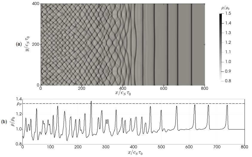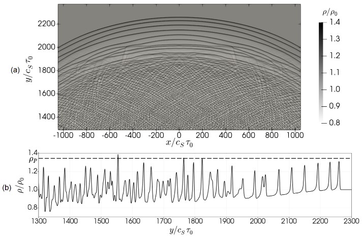 С помощью численного моделирования продемонстрировано, что в тепловыделяющей среде с изоэнтропической неустойчивостью происходит распад локализованного возмущения (например, области теплового взрыва) на систему концентрических газодинамических волн, амплитуда которых определяется свойствами не начального возмущения, а среды (рис.1). Для наблюдения такой картины необходимо, чтобы размер тепловыделяющей среды превышал характерный масштаб усиления. Такие условия могут выполняться в астрофизических системах.