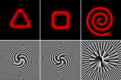 В частности, в семействе спиральных пучков авторами теоретически найдены и на отдельных примерах реализованы экспериментально спиральные пучки в форме произвольных кривых или их совокупности. Примеры пучков приведены на рис.2. Отметим еще раз, что в отличие от световых полей с заданным распределением интенсивности, формируемых ранее известными методами, эти спиральные пучки сохраняют свою структуру в любой плоскости наблюдения и фокусировки. Таким образом, данное свойство спиральных пучков позволяет весьма гибко менять их форму при сохранении структурной устойчивости, что представляет существенный интерес для лазерной медицины и технологии.